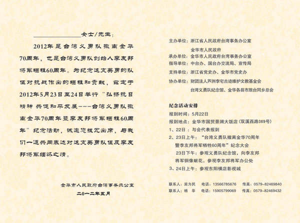 台湾义勇队是抗战时期由台湾同胞组成,直接参加祖国抗战的数量最多、影响最大、持续时间最长的一支抗日队伍。1939年2月22日,在中共浙江省委的指导帮助下,在闽浙两省政府的支持下,台湾义勇队及由其领导的台湾少年团在当时浙江省的抗战中心——金华市区酒坊巷18号成立(现84号)。其创始人是当年第一位参加祖国大陆抗战的台籍抗日将领、黄埔二期学生李友邦将军(1906—1952)。这是台湾人民第一次有组织的参加祖国的抗战。