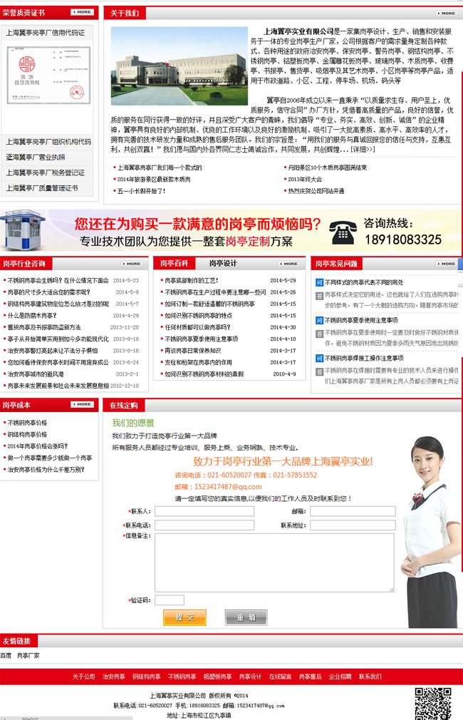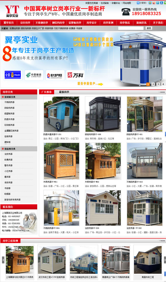 上海翼亭实业有限公司是一家集岗亭设计、生产、销售和安装服务于一体的专业岗亭生产厂家,公司根据客户的需求量身定制各种款式、各种用途的政府治安岗亭、保安岗亭、警务岗亭、钢结构岗亭、不锈钢岗亭、铝塑板岗亭、金属雕花板岗亭、玻璃岗亭、木质岗亭、收费亭、书报亭、售货亭、吸烟亭及其艺术岗亭、小区岗亭等岗亭产品,适用于市政道路、小区、工程、停车场、机场、码头等